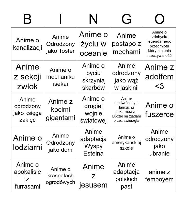 This bingo card has a free space and 24 words: Anime Odrodzony jako dom, Anime o krasnalach ogrodówych, Anime o byciu skrzynią skarbów, Anime o apokalisie z furrasami, Anime o zdobyciu legendarnego przedmiotu który zmienia rzeczywistość, Anime o kanalizacji, Anime z sekcji zwłok, Anime Odrodzony jako Toster, Anime o odwróconym łańcuchu pokarmowym Ludzie są zjadani przez zwierzęta, Anime adaptacja Wyspy Esteina, Anime odrodzony jako wąż w jaskinii, Anime odrodzony jako księga zaklęć, Anime o amerykańskiej szkole, Anime odrodzony jako ubranie, Anime o mechaniku isekai, Anime adaptacja polskich past, Anime o fuszerce, Anime o życiu w oceanie, Anime z adolfem <3, Anime z kocimi gigantami, anime z femboyem, Anime o lodziarni, Anime postapo z mechami and Anime z jesusem.