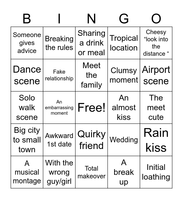 This bingo card has a free space and 29 words: A musical montage, A big misunderstanding, An embarrassing moment, Family drama, Someone gives advice, Sharing a drink or meal, Fake relationship, Awkward 1st date, An almost kiss, With the wrong guy/girl, The meet cute, Initial loathing, Total makeover, A break up, Airport scene, Realize they are in love, Quirky friend, Big city to small town, Cheesy “look into the distance “, Solo walk scene, Wedding, Grand gesture, Clumsy moment, Dance scene, Tropical location, Breaking the rules, Rain kiss, Meet the family and Evil Ex.