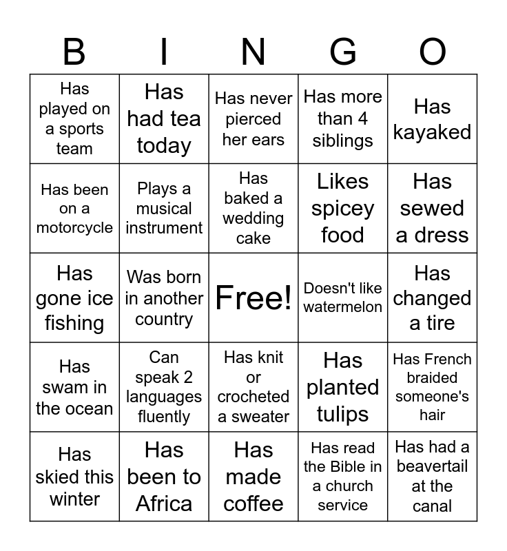 This bingo card has a free space and 24 words: Can speak 2 languages fluently, Has been to Africa, Has baked a wedding cake, Has skied this winter, Has kayaked, Has played on a sports team, Has been on a motorcycle, Has had tea today, Doesn't like watermelon, Has knit or crocheted a sweater, Likes spicey food, Has gone ice fishing, Has planted tulips, Has French braided someone's hair, Plays a musical instrument, Has read the Bible in a church service, Has changed a tire, Has never pierced her ears, Has sewed a dress, Was born in another country, Has had a beavertail at the canal, Has swam in the ocean, Has more than 4 siblings and Has made coffee.