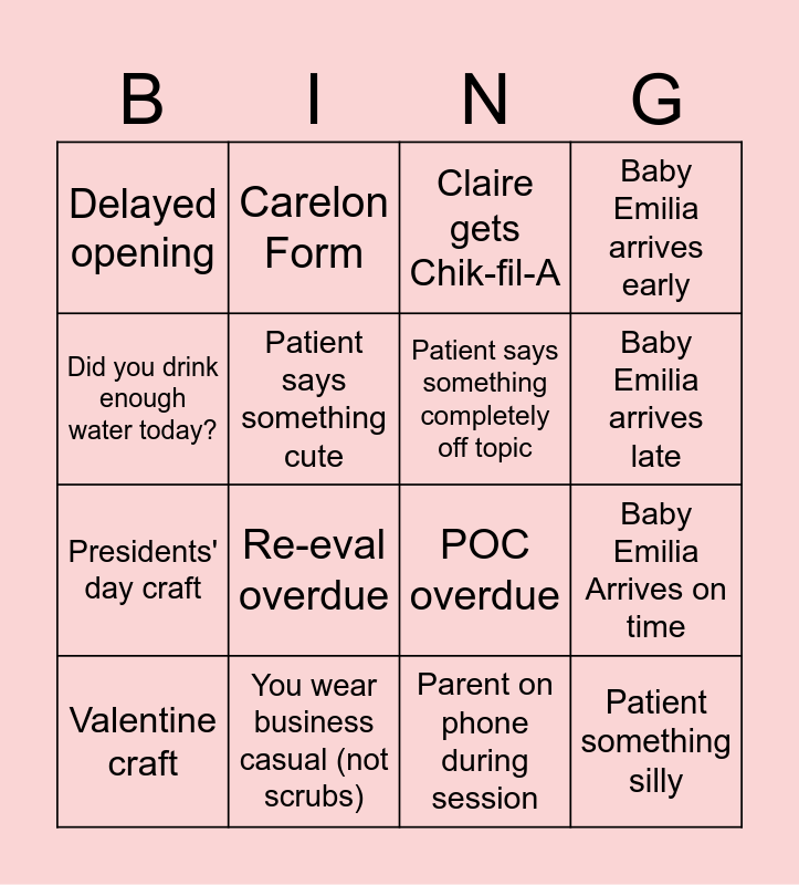 This bingo card has 20 words: Baby Emilia Arrives on time, Walter Soto e-mails us (again), Claire gets Chik-fil-A, Patient gives you a Valentine, Valentine craft, Did you drink enough water today?, You wear business casual (not scrubs), Delayed opening, Presidents' day craft, Carelon Form, Re-eval overdue, POC overdue, Patient says something cute, Patient something silly, Patient says something completely off topic, No-show after confirming appt, Baby Emilia arrives late, Baby Emilia arrives early, Parent on phone during session and Marker or crayon anywhere but paper.