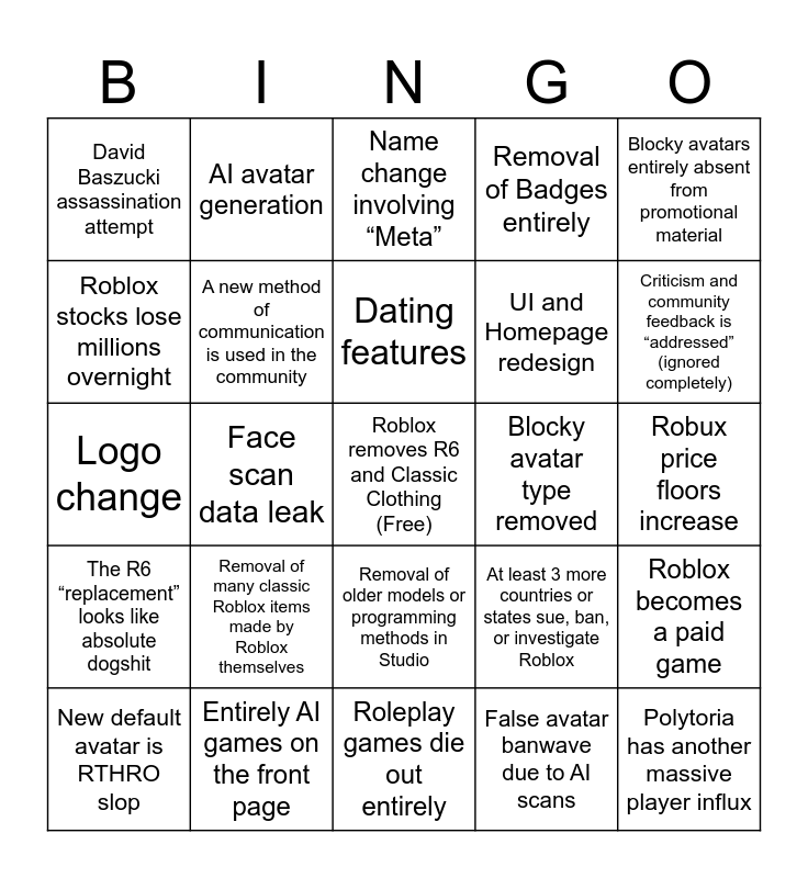This bingo card has a free space and 24 words: Removal of many classic Roblox items made by Roblox themselves, Entirely AI games on the front page, Dating features, New default avatar is RTHRO slop, Blocky avatars entirely absent from promotional material, David Baszucki assassination attempt, Roblox stocks lose millions overnight, AI avatar generation, Blocky avatar type removed, Removal of older models or programming methods in Studio, UI and Homepage redesign, Logo change, At least 3 more countries or states sue, ban, or investigate Roblox, Roblox becomes a paid game, A new method of communication is used in the community, False avatar banwave due to AI scans, Robux price floors increase, Name change involving “Meta”, Criticism and community feedback is “addressed” (ignored completely), Face scan data leak, Polytoria has another massive player influx, The R6 “replacement” looks like absolute dogshit, Removal of Badges entirely and Roleplay games die out entirely.
