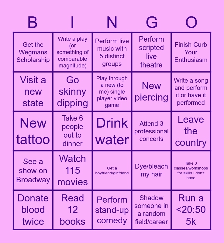 This bingo card has a free space and 24 words: Watch 115 movies, Read 12 books, Play through a new (to me) single player video game, Donate blood twice, Finish Curb Your Enthusiasm, Get the Wegmans Scholarship, Visit a new state, Write a play (or something of comparable magnitude), Attend 3 professional concerts, Get a boyfriend/girlfriend, New piercing, New tattoo, Dye/bleach my hair, Take 3 classes/workshops for skills I don’t have, Go skinny dipping, Shadow someone in a random field/career, Leave the country, Perform live music with 5 distinct groups, Write a song and perform it or have it performed, Take 6 people out to dinner, Run a <20:50 5k, See a show on Broadway, Perform scripted live theatre and Perform stand-up comedy.