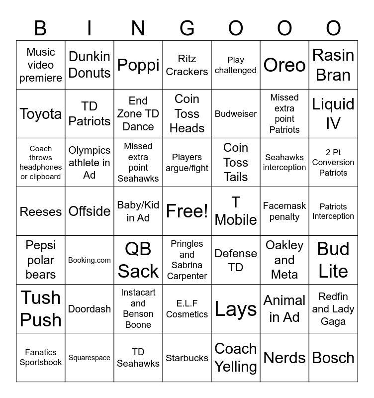This bingo card has a free space and 72 words: Dorritos, Dunkin Donuts, Budweiser, Bud Lite, Clydesdales, Stella Artois, Ritz Crackers, TD Seahawks, TD Patriots, 2 Pt Conversion Seahawks, 2 Pt Conversion Patriots, Cadillac F1 Car Reveal, End Zone TD Dance, Music video premiere, Movie Trailer, Coin Toss Heads, Coin Toss Tails, Play challenged, Coach Yelling, Coach throws headphones or clipboard, Missed extra point Seahawks, Missed extra point Patriots, Seahawks interception, Patriots Interception, QB Sack, Animal in Ad, Instacart and Benson Boone, Lays, Pringles and Sabrina Carpenter, Squarespace, Reeses, Nerds, Michelob Ultra, Uber Eats, Baby/Kid in Ad, Oakley and Meta, AI, Taco Bell, Oreo, Booking.com, Players argue/fight, Bosch, Fanatics Sportsbook, Hellmans, Novartis, Olympics athlete in Ad, Pepsi polar bears, Redfin and Lady Gaga, 35+ Yard Pass, Defense TD, Tush Push, Dove, Doordash, Liquid IV, T Mobile, XFinity, Poppi, Toyota, Jeep, VW, EOS, Liquid Death, Facemask penalty, Offside, Play challenged, E.L.F Cosmetics, Rasin Bran, Starbucks, Tree Hut, StateFarm, Oikos and Pass interference.