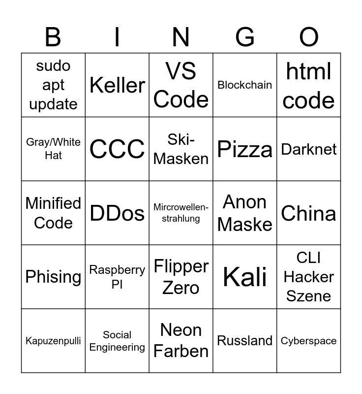This bingo card has 25 words: Raspberry PI, Neon Farben, Ski-Masken, Kapuzenpulli, html code, sudo apt update, Gray/White Hat, Keller, Anon Maske, Flipper Zero, Pizza, Minified Code, Kali, CLI Hacker Szene, CCC, Cyberspace, China, VS Code, Darknet, DDos, Mircrowellen- strahlung, Social Engineering, Phising, Blockchain and Russland.