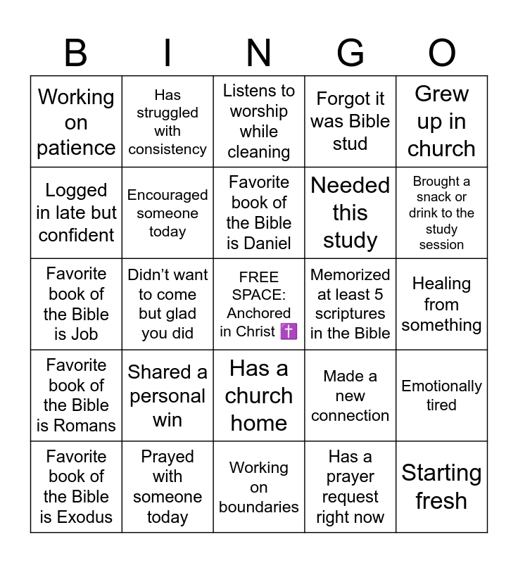 This bingo card has a free space and 34 words: Is new to the group, Has a prayer request right now, Has done a fast before, Is trusting God for something big this year, Favorite book of the Bible is Romans, Encouraged someone today, Grew up in church, Favorite book of the Bible is Exodus, Has struggled with consistency, Has a kid or kids, Favorite book of the Bible is Daniel, Listens to worship while cleaning, Reads devotionals, Wants deeper faith this year, Memorized at least 5 scriptures in the Bible, Brought a snack or drink to the study session, Prayed with someone today, Favorite book of the Bible is Job, Shared a personal win, Made a new connection, Has a church home, Loves reading, Working on patience, Healing from something, Working on boundaries, Starting fresh, Forgot it was Bible stud, Has a favorite “cry song”, Needed this study, Logged in late but confident, Has a Bible with coffee stains, Didn’t want to come but glad you did, Emotionally tired and Spiritually hungry.