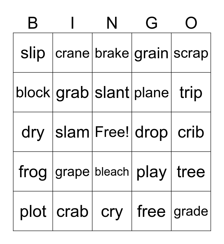 This bingo card has a free space and 24 words: grape, crab, slant, plot, scrap, slip, block, crane, drop, bleach, plane, dry, play, tree, grab, free, crib, brake, trip, slam, grade, frog, grain and cry.