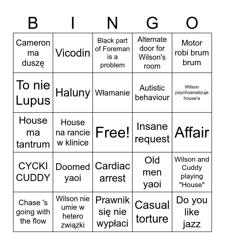 This bingo card has a free space and 24 words: Doomed yaoi, Wilson nie umie w hetero związki, Włamanie, Chase 's going with the flow, Motor robi brum brum, Cameron ma duszę, To nie Lupus, Vicodin, Insane request, Cardiac arrest, Autistic behaviour, House ma tantrum, Old men yaoi, Wilson and Cuddy playing "House", Haluny, Casual torture, Affair, Black part of Foreman is a problem, Wilson psychoanalizuje house'a, House na rancie w klinice, Do you like jazz, CYCKI CUDDY, Alternate door for Wilson's room and Prawnik się nie wypłaci.