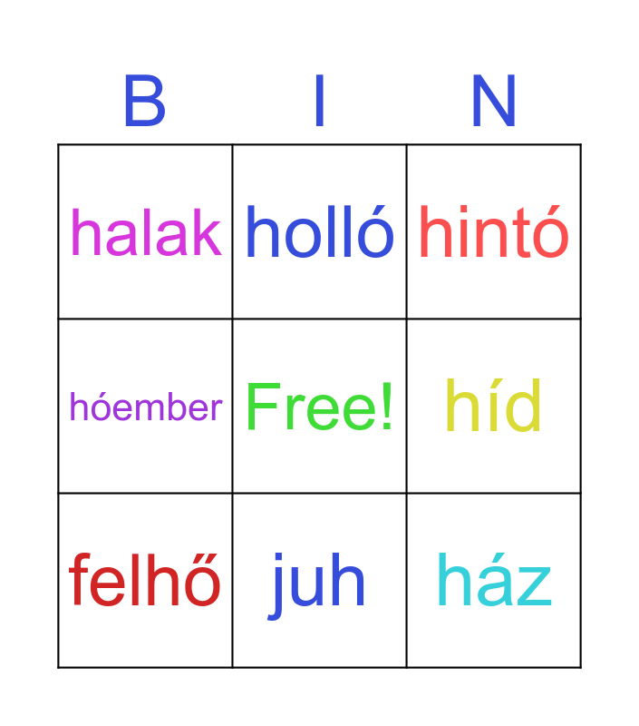 This bingo card has a free space and 9 words: felhő, hintó, holló, hóember, halak, híd, ház, hinta and juh.