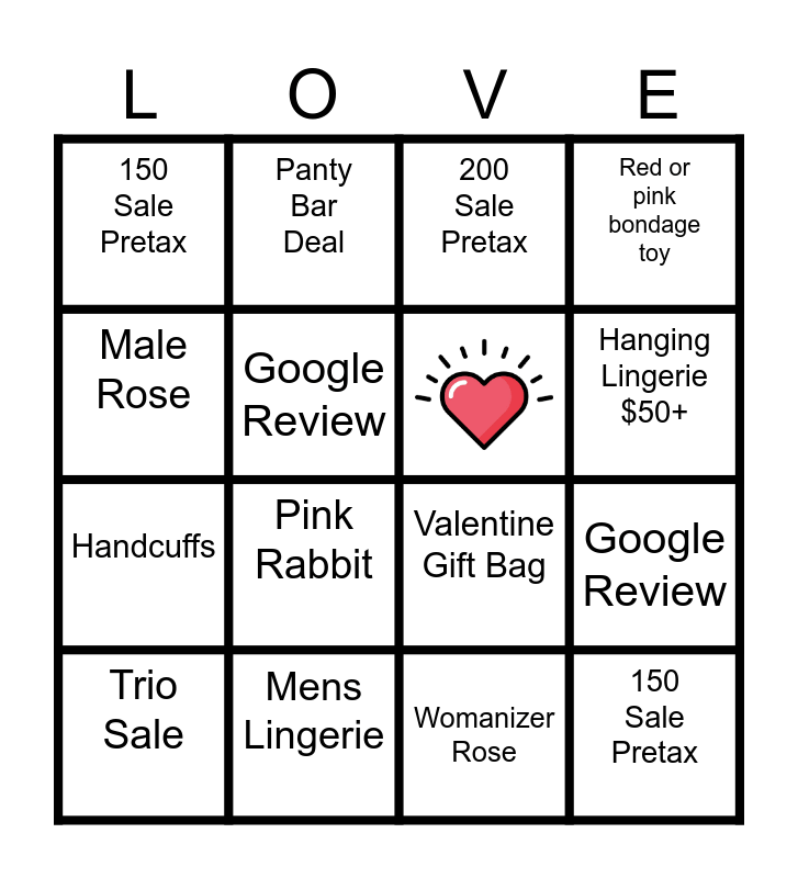 This bingo card has 1 images and 15 words: Mens Lingerie, Google Review, 200 Sale Pretax, 150 Sale Pretax, Handcuffs, Panty Bar Deal, Valentine Gift Bag, Womanizer Rose, Male Rose, Google Review, Trio Sale, Red or pink bondage toy, Pink Rabbit, Hanging Lingerie $50+ and 150 Sale Pretax.