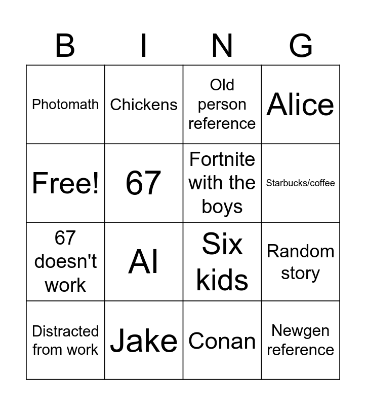This bingo card has 16 words: Jake, Random story, Old person reference, Photomath, 67 doesn't work, Chickens, Six kids, Conan, Free!, 67, Distracted from work, Alice, AI, Starbucks/coffee, Fortnite with the boys and Newgen reference.