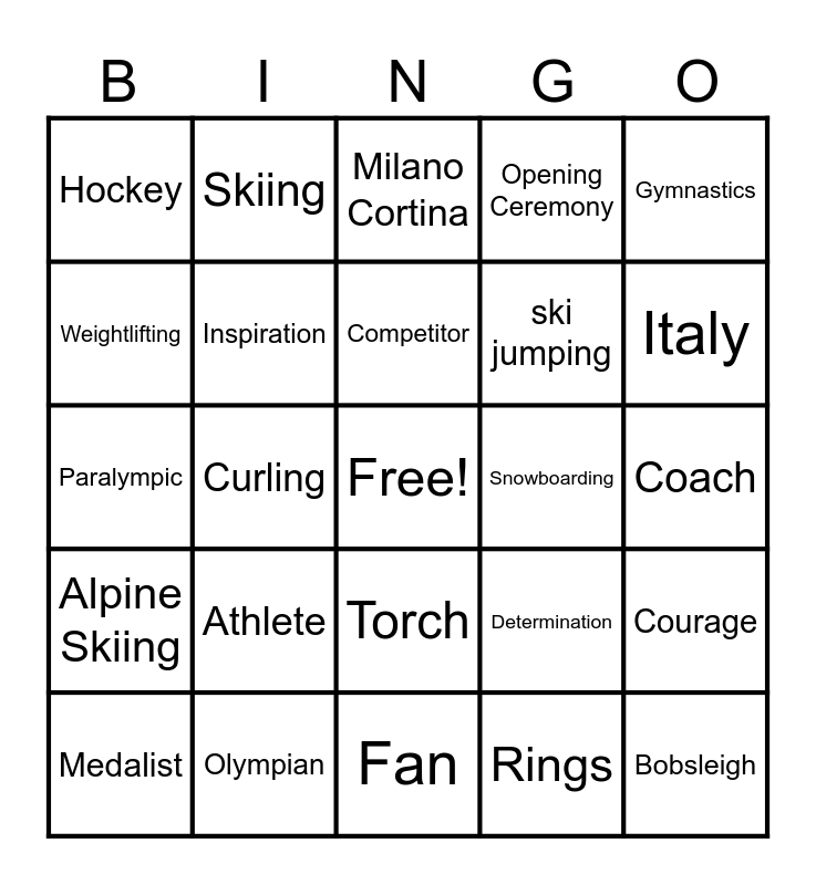 This bingo card has a free space and 24 words: Athlete, Olympian, Competitor, Medalist, Gymnastics, Hockey, Weightlifting, Skiing, Snowboarding, Torch, ski jumping, Paralympic, Determination, Courage, Inspiration, Rings, Coach, Milano Cortina, Italy, Curling, Bobsleigh, Alpine Skiing, Opening Ceremony and Fan.
