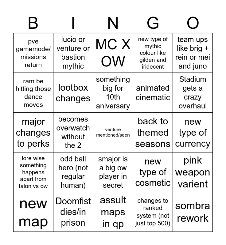 This bingo card has a free space and 24 words: odd ball hero (not regular human), Doomfist dies/in prison, something big for 10th aniversary, new map, team ups like brig + rein or mei and juno, pve gamemode/ missions return, ram be hitting those dance moves, lucio or venture or bastion mythic, back to themed seasons, smajor is a big ow player in secret, animated cinematic, major changes to perks, new type of cosmetic, pink weapon varient, lootbox changes, changes to ranked system (not just top 500), new type of currency, MC X OW, Stadium gets a crazy overhaul, becomes overwatch without the 2, sombra rework, lore wise something happens apart from talon vs ow, new type of mythic colour like gilden and iridecent and assult maps in qp.