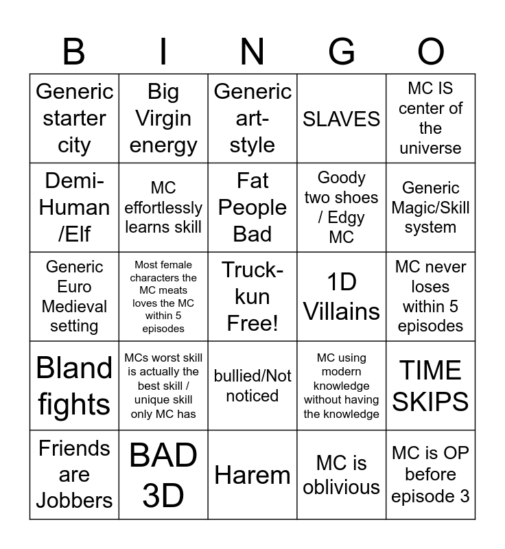This bingo card has a free space and 29 words: Friends are Jobbers, Adventure Guild, Most female characters the MC meats loves the MC within 5 episodes, RPG/MMO game system, Generic starter city, Generic art-style, MC effortlessly learns skill, MCs worst skill is actually the best skill / unique skill only MC has, 1D Villains, BAD 3D, MC never loses within 5 episodes, MC is OP before episode 3, Harem, MC is oblivious, Generic Magic/Skill system, Childhood best friend, bullied/Not noticed, Bland fights, MC IS center of the universe, Generic Euro Medieval setting, MC using modern knowledge without having the knowledge, Fan-service, Goody two shoes / Edgy MC, Demi-Human /Elf, SLAVES, Big Virgin energy, TIME SKIPS, Fat People Bad and Gods.