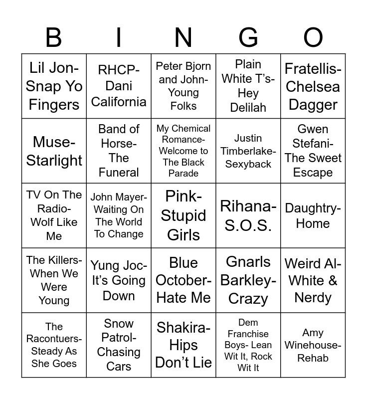 This bingo card has 27 words: Gnarls Barkley- Crazy, Amy Winehouse- Rehab, Justin Timberlake- Sexyback, Shakira- Hips Don’t Lie, Muse- Starlight, Peter Bjorn and John- Young Folks, RHCP- Dani California, The Killers- When We Were Young, Rihana- S.O.S., Weird Al- White & Nerdy, TV On The Radio- Wolf Like Me, Plain White T’s- Hey Delilah, The Racontuers- Steady As She Goes, Snow Patrol- Chasing Cars, Gwen Stefani- The Sweet Escape, Fergie- Big Girls Don’t Cry, Band of Horse- The Funeral, My Chemical Romance- Welcome to The Black Parade, Yung Joc- It’s Going Down, Lil Jon- Snap Yo Fingers, Daughtry- Home, Dem Franchise Boys- Lean Wit It, Rock Wit It, John Mayer- Waiting On The World To Change, Pink- Stupid Girls, Blue October- Hate Me, Fratellis- Chelsea Dagger and Yeah Yeah Yeahs- Gold Lion.