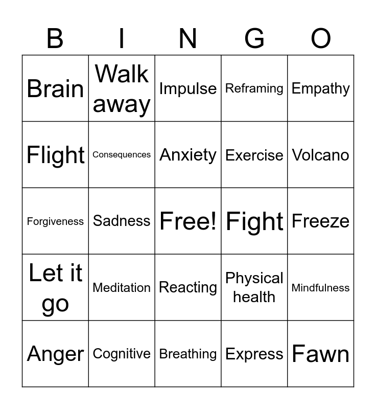 This bingo card has a free space and 29 words: Anger, Stress, Sadness, Cortisol, Brain, Impulse, Consequences, Meditation, Fight, Cognitive, Freeze, Fawn, Breathing, Express, Volcano, Relationships, Reacting, Let it go, Empathy, Forgiveness, Physical health, Physiology, Exercise, Flight, Reframing, Walk away, Mindfulness, Anxiety and Irritability.