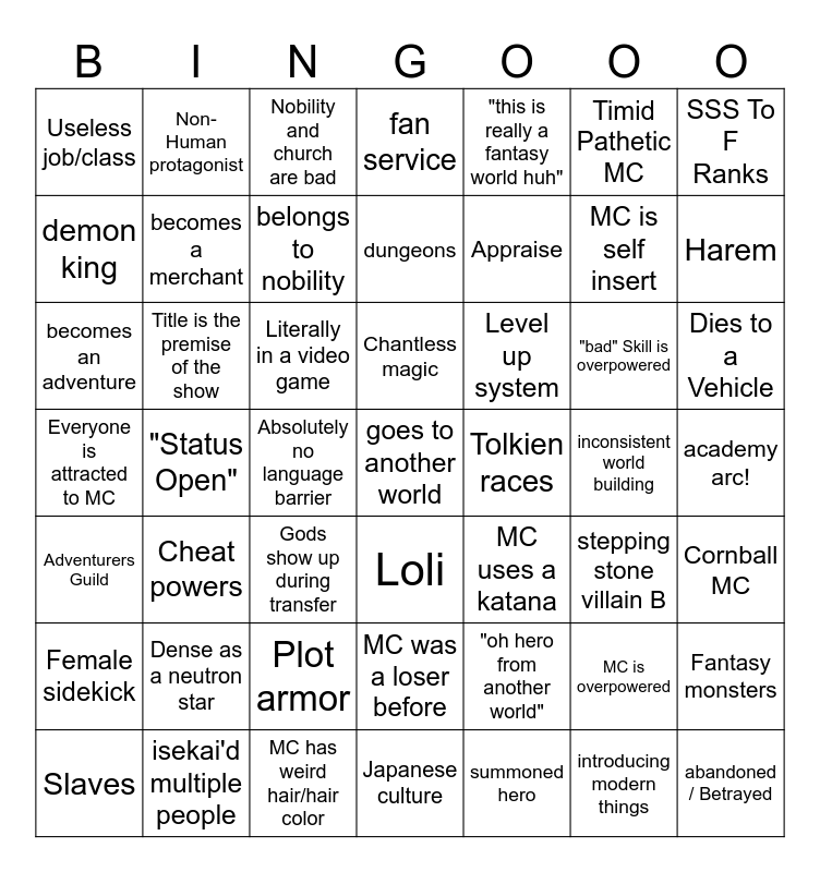 This bingo card has a free space and 48 words: Adventurers Guild, "Status Open", MC has weird hair/hair color, Loli, Appraise, inconsistent world building, SSS To F Ranks, Slaves, Title is the premise of the show, Absolutely no language barrier, fan service, "this is really a fantasy world huh", "bad" Skill is overpowered, Dies to a Vehicle, Everyone is attracted to MC, Dense as a neutron star, Nobility and church are bad, Chantless magic, "oh hero from another world", Timid Pathetic MC, Harem, demon king, Non- Human protagonist, belongs to nobility, summoned hero, MC is self insert, academy arc!, Female sidekick, Cheat powers, Literally in a video game, MC was a loser before, Level up system, MC is overpowered, Fantasy monsters, Useless job/class, isekai'd multiple people, Gods show up during transfer, Japanese culture, Tolkien races, introducing modern things, Cornball MC, becomes an adventure, becomes a merchant, Plot armor, dungeons, MC uses a katana, stepping stone villain B and abandoned / Betrayed.