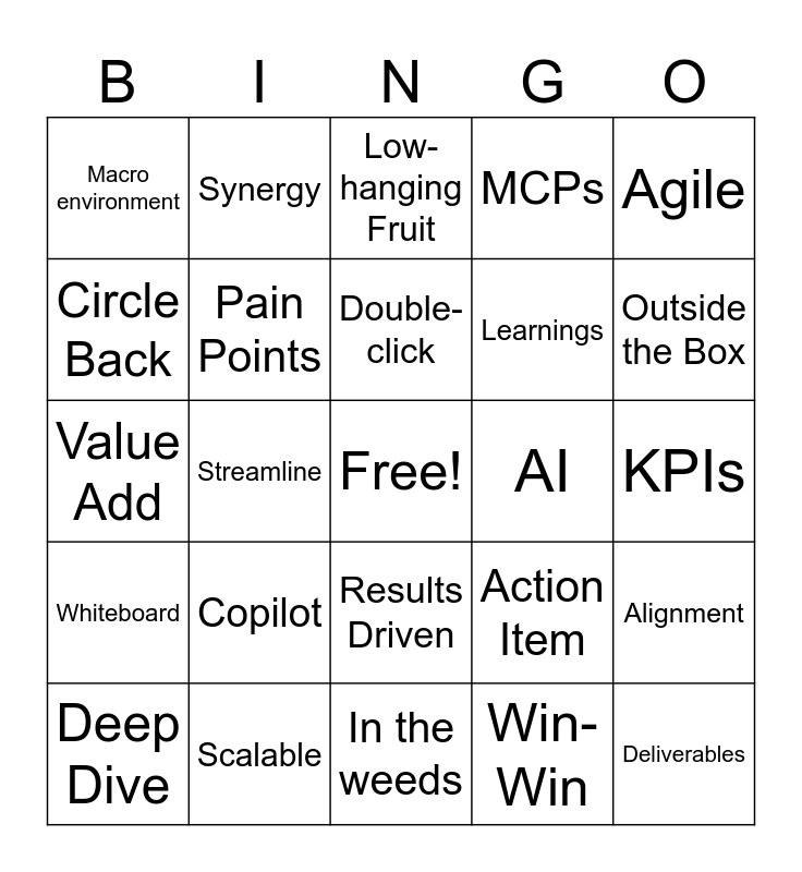 This bingo card has a free space and 24 words: Copilot, Scalable, Double-click, Deep Dive, Agile, Macro environment, Circle Back, Synergy, AI, Results Driven, Learnings, Value Add, Action Item, Alignment, Pain Points, Win-Win, KPIs, Low-hanging Fruit, Outside the Box, Streamline, Deliverables, Whiteboard, MCPs and In the weeds.