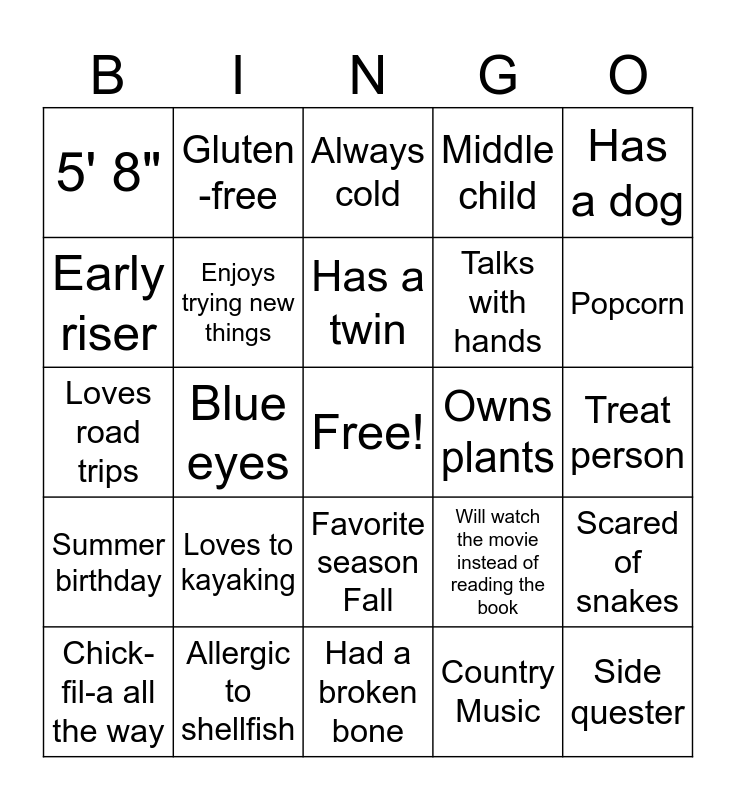 This bingo card has a free space and 24 words: Loves to kayaking, Allergic to shellfish, Has a twin, Chick-fil-a all the way, Has a dog, 5' 8", Early riser, Gluten -free, Owns plants, Favorite season Fall, Talks with hands, Loves road trips, Will watch the movie instead of reading the book, Scared of snakes, Enjoys trying new things, Country Music, Treat person, Always cold, Popcorn, Blue eyes, Side quester, Summer birthday, Middle child and Had a broken bone.