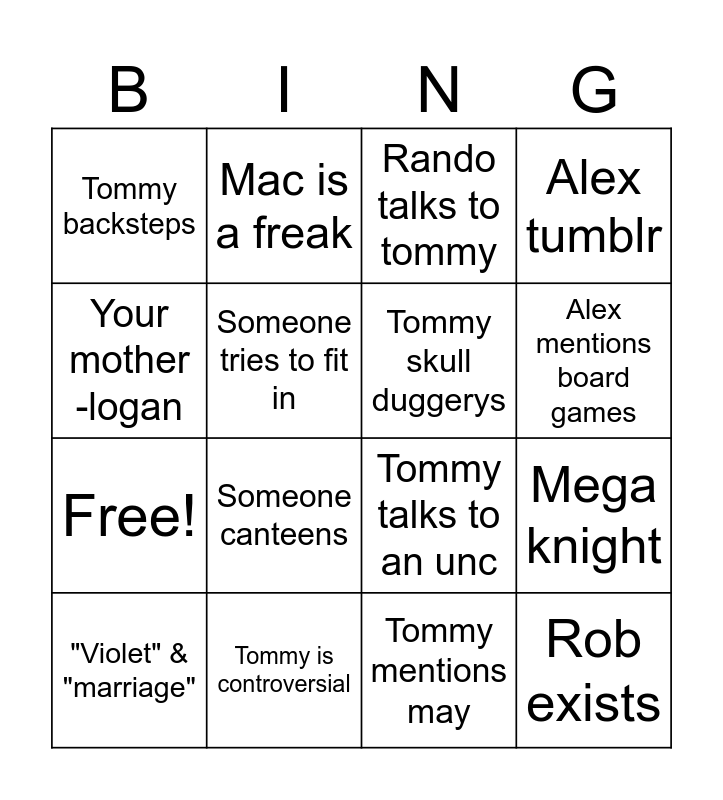 This bingo card has 20 words: Mega knight, Alex looks down, Rando talks to tommy, Alex sighs and gives up, "Violet" & "marriage", Your mother -logan, Tommy is controversial, Tommy backsteps, Free!, Mac is a freak, Someone canteens, Tommy talks to an unc, Someone tries to fit in, Rob exists, Tommy skull duggerys, Percy jackson, Alex mentions board games, Alex tumblr, Tommy mentions may and Alex apologies for no reason.