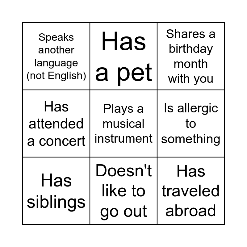 This bingo card has 12 words: Plays a sport, Has traveled abroad, Plays a musical instrument, Is allergic to something, Has a pet, Shares a birthday month with you, Doesn't like to go out, Loves to play video games, Speaks another language (not English), Has attended a concert, Has siblings and Has been to a soccer match.