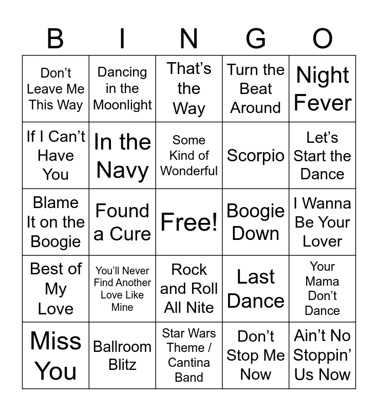 This bingo card has a free space and 39 words: Golden Years, Pick Up the Pieces, I Want Your Love, In the Navy, Miss You, Rock and Roll All Nite, Some Kind of Wonderful, Jungle Boogie, Night Fever, Best of My Love, Found a Cure, Turn the Beat Around, Ain’t No Stoppin’ Us Now, I Wanna Be Your Lover, Boogie Down, You’ll Never Find Another Love Like Mine, Heaven Must Have Sent You, Don’t Leave Me This Way, Victim of Love, Last Dance, If I Can’t Have You, Star Wars Theme / Cantina Band, Scorpio, Let’s Start the Dance, Car Wash, It’s All the Way Live, Hot Pants, Give Up the Funk, Sir Duke, Dancing in the Moonlight, I’ll Be Good to You, Listen to the Music, That’s the Way, Ballroom Blitz, Don’t Stop Me Now, Crocodile Rock, Your Mama Don’t Dance, Blame It on the Boogie and Jive Talkin’.