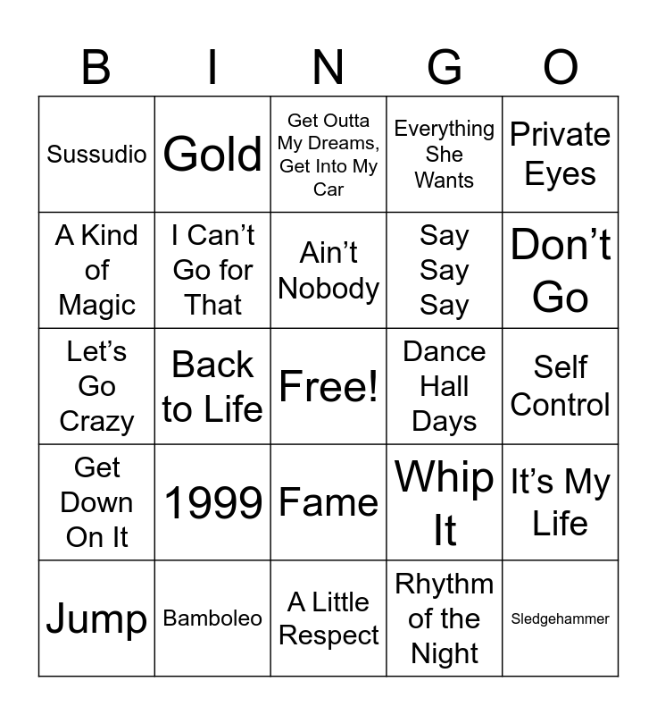 This bingo card has a free space and 40 words: Relax, Let’s Go Crazy, Forget Me Nots, I Can’t Go for That, Bamboleo, Fame, Ain’t Nobody, Modern Love, Private Eyes, Get Down On It, Back to Life, Everything She Wants, Sledgehammer, Self Control, Dance Hall Days, 1999, It’s Still Rock and Roll to Me, Sussudio, Hip to Be Square, Get Outta My Dreams, Get Into My Car, It’s My Life, Rhythm of the Night, Say Say Say, A Kind of Magic, Never Too Much, Always on My Mind, Come On Eileen, Word Up, The Heat Is On, Girl You Know It’s True, My Prerogative, Jump, Two of Hearts, Whip It, Don’t Go, A Little Respect, Addicted to Love, Let It Whip, Gold and She Works Hard for the Money.