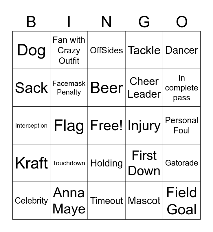 This bingo card has a free space and 24 words: Touchdown, Anna Maye, Beer, Celebrity, Dancer, Dog, Sack, Fan with Crazy Outfit, Injury, Holding, Cheer Leader, Interception, First Down, Gatorade, Facemask Penalty, Mascot, Personal Foul, OffSides, In complete pass, Flag, Field Goal, Kraft, Tackle and Timeout.
