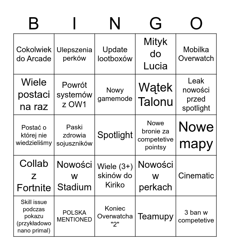 This bingo card has a free space and 24 words: Nowości w Stadium, POLSKA MENTIONED, Nowy gamemode, Skill issue podczas pokazu (przykładowo nano primal), Mobilka Overwatch, Cokolwiek do Arcade, Wiele postaci na raz, Ulepszenia perków, Nowe bronie za competetive pointsy, Wiele (3+) skinów do Kiriko, Wątek Talonu, Postać o której nie wiedzieliśmy, Nowości w perkach, Cinematic, Powrót systemów z OW1, Teamupy, Nowe mapy, Update lootboxów, Leak nowości przed spotlight, Paski zdrowia sojuszników, 3 ban w competetive, Collab z Fortnite, Mityk do Lucia and Koniec Overwatcha "2".