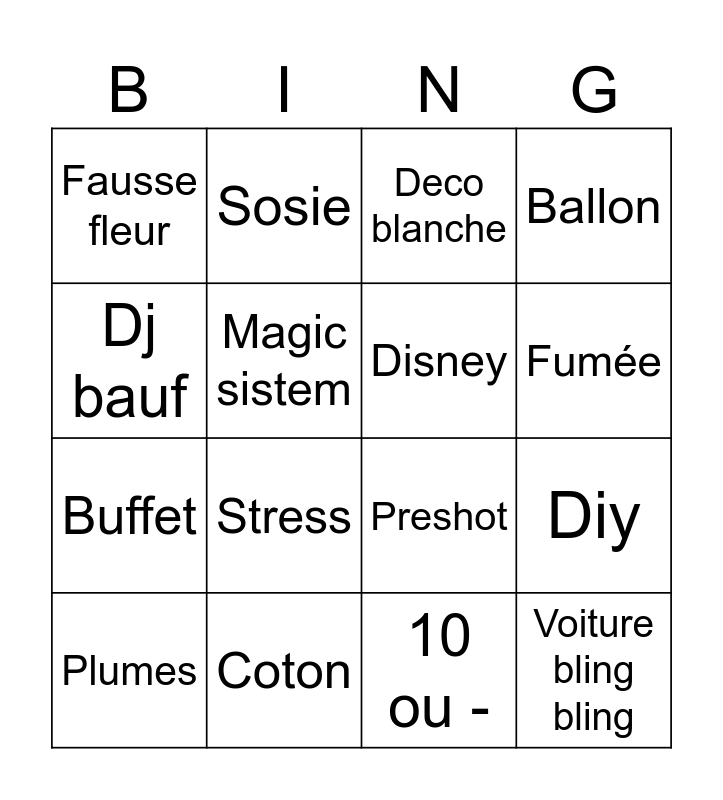 This bingo card has 16 words: Coton, Diy, Deco blanche, Fausse fleur, Buffet, Sosie, Preshot, 10 ou -, Dj bauf, Magic sistem, Plumes, Ballon, Stress, Fumée, Disney and Voiture bling bling.