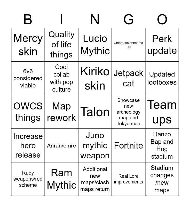 This bingo card has a free space and 24 words: Anran/emre, Ram Mythic, Kiriko skin, Ruby weapons/red scheme, Perk update, Mercy skin, 6v6 considered viable, Quality of life things, Showcase new archeology map and Tokyo map, Juno mythic weapon, Jetpack cat, OWCS things, Fortnite, Hanzo Bap and Hog stadium, Cool collab with pop culture, Real Lore improvements, Team ups, Lucio Mythic, Updated lootboxes, Map rework, Stadium changes /new maps, Increase hero release, Cinematic/animated lore and Additional new maps/clash maps return.