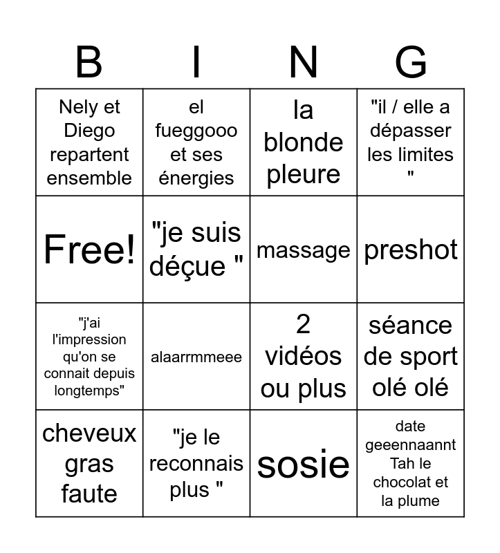 This bingo card has 16 words: "je le reconnais plus ", séance de sport olé olé, la blonde pleure, Nely et Diego repartent ensemble, "j'ai l'impression qu'on se connait depuis longtemps", el fueggooo et ses énergies, 2 vidéos ou plus, sosie, Free!, "je suis déçue ", cheveux gras faute, "il / elle a dépasser les limites ", alaarrmmeee, preshot, massage and date geeennaannt Tah le chocolat et la plume.
