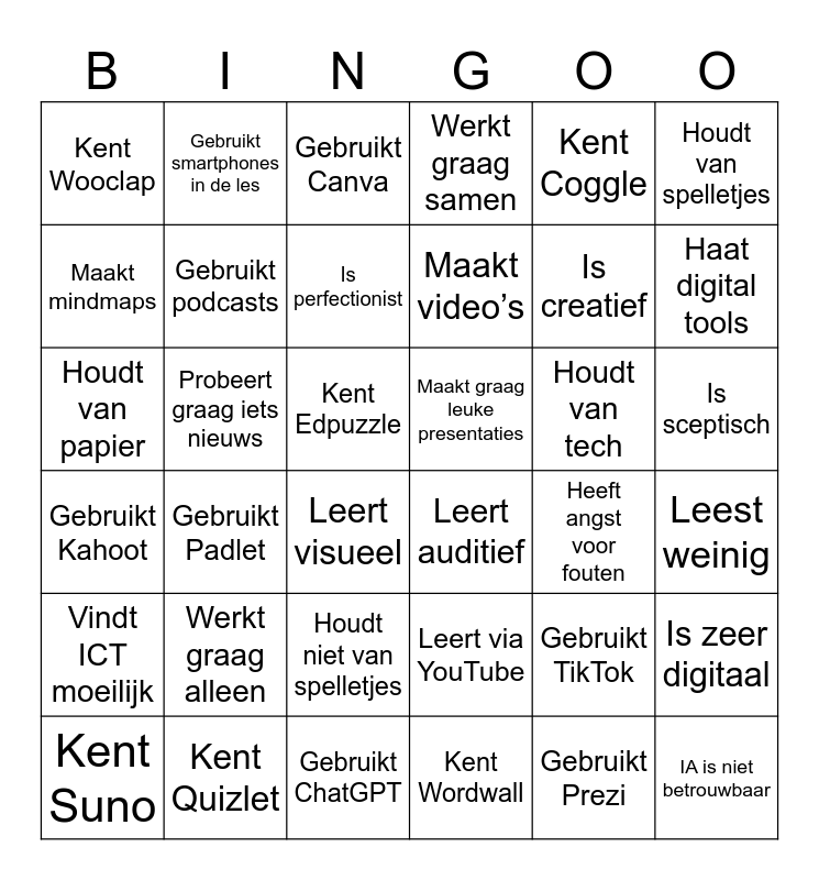 This bingo card has 36 words: Gebruikt Kahoot, Gebruikt Padlet, Gebruikt ChatGPT, Maakt video’s, Houdt van tech, Is sceptisch, Kent Wooclap, Kent Quizlet, Gebruikt Canva, Leert via YouTube, Is creatief, Houdt van spelletjes, Vindt ICT moeilijk, Probeert graag iets nieuws, Is perfectionist, Werkt graag samen, Gebruikt TikTok, Leest weinig, Maakt mindmaps, Gebruikt podcasts, Leert visueel, Leert auditief, Heeft angst voor fouten, Is zeer digitaal, Houdt van papier, Gebruikt smartphones in de les, Kent Edpuzzle, Kent Wordwall, Kent Coggle, Haat digital tools, Kent Suno, Werkt graag alleen, Houdt niet van spelletjes, Maakt graag leuke presentaties, Gebruikt Prezi and IA is niet betrouwbaar.