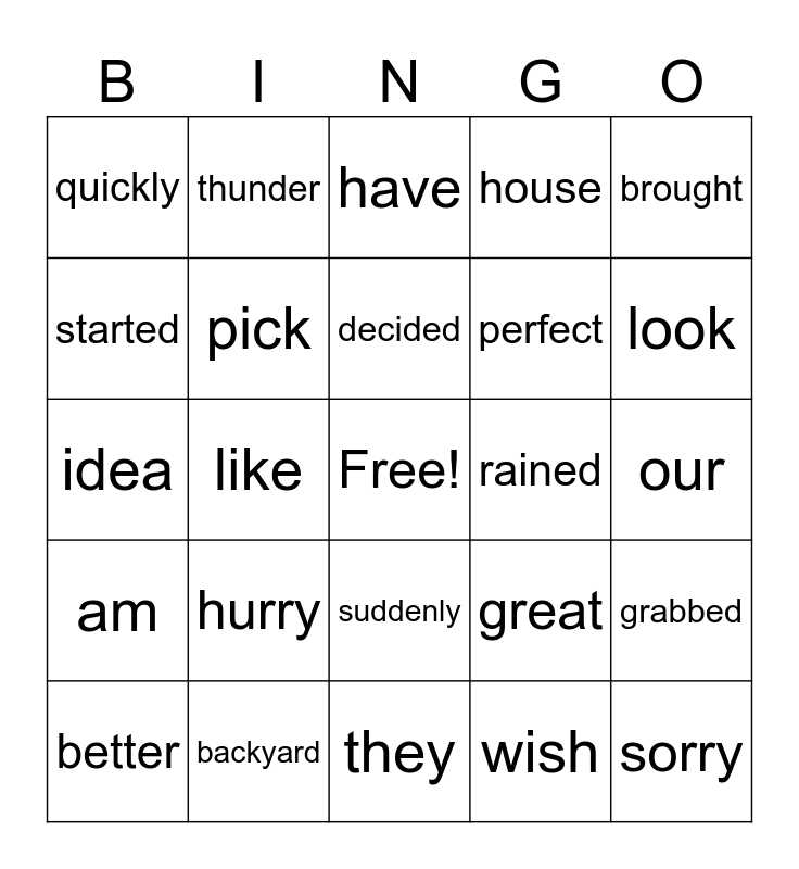 This bingo card has a free space and 24 words: hurry, backyard, decided, better, brought, quickly, started, thunder, rained, suddenly, perfect, idea, great, grabbed, pick, wish, our, have, look, like, sorry, am, house and they.