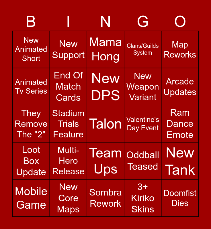 This bingo card has a free space and 29 words: Mobile Game, Fortnite Collab, Stadium Trials Feature, Lucio Mythic Skin, New Animated Short, Mama Hong, End Of Match Cards, Multi-Hero Release, Valentine's Day Event, New Core Maps, Ram Dance Emote, Doomfist Dies, Sombra Rework, 3+ Kiriko Skins, Arcade Updates, New Map Type, Team Ups, Loot Box Update, Map Reworks, They Remove The "2", Oddball Teased, Anime Collabs, New Weapon Variant, Animated Tv Series, Clans/Guilds System, New Support, New Tank, New DPS and 2026 Overwatch Roadmap.