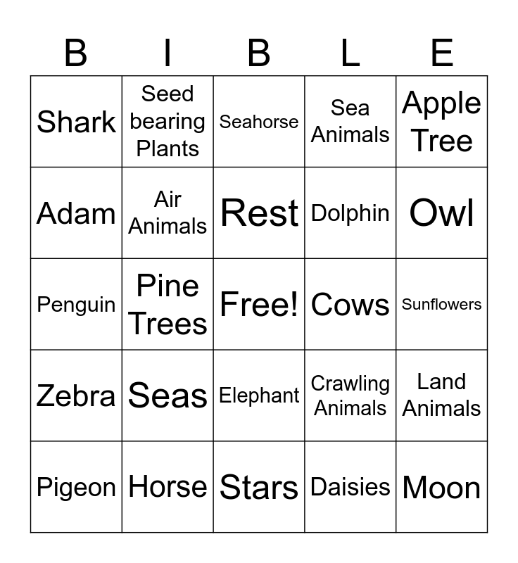 This bingo card has a free space and 49 words: Light, Moon, Sun, Stars, Seas, Fruit Trees, Seed bearing Plants, Livestock, Adam, Eve, Air Animals, Sea Animals, Land Animals, Crawling Animals, Land, Sky, Rest, Cows, Whales, Apple Tree, Pine Trees, Daisies, Shark, Dolphin, Eagle, Owl, Pigeon, Dove, Elephant, Zebra, Deer, Skunk, Lion, Sheep, Horse, Goat, Octopus, Eel, Sunflowers, Pear Tree, Fig Tree, Peach tree, Sting Ray, Wallrus, Penguin, Seahorse, Crab, Clownfish and Giraffe.