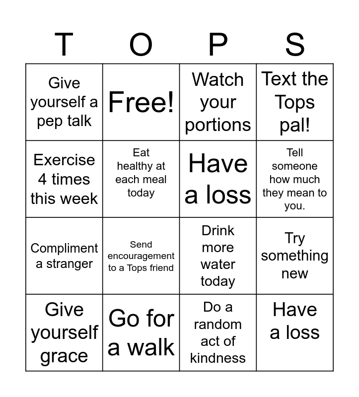 This bingo card has 19 words: Drink more water today, Make a healthy food choice, Watch your portions, Have a loss, Try something new, Exercise 4 times this week, Do a random act of kindness, Give yourself a pep talk, Free!, Compliment a stranger, Send encouragement to a Tops friend, Eat healthy at each meal today, Have a loss, Go for a walk, Give yourself grace, Veggies and/or fruits today, Text the Tops pal!, Tell someone how much they mean to you. and Cut one bad thing from your diet this week..
