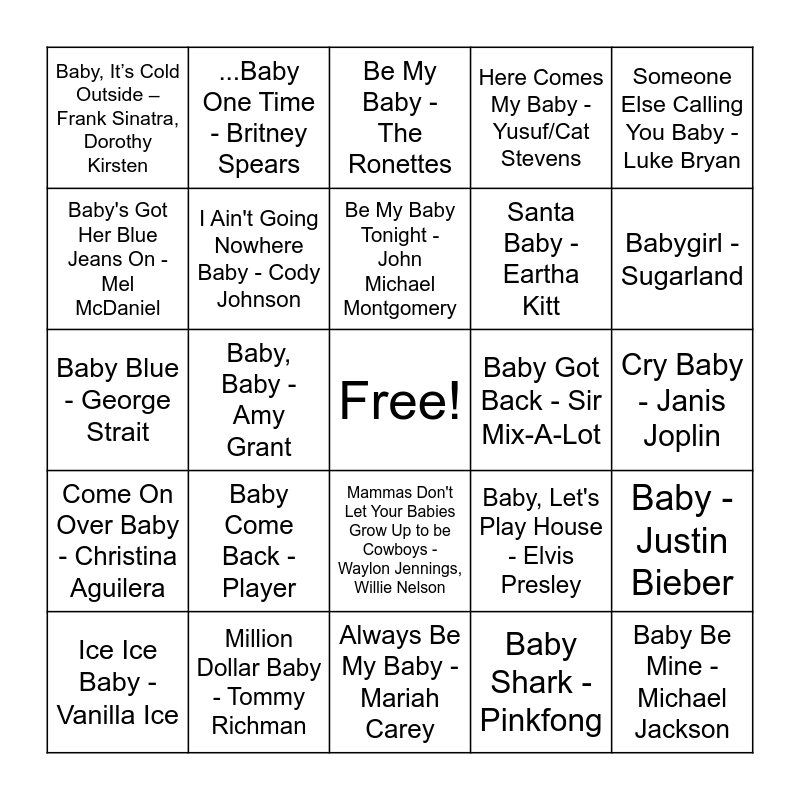 This bingo card has a free space and 25 words: Baby Come Back - Player, Always Be My Baby - Mariah Carey, Be My Baby Tonight - John Michael Montgomery, Ice Ice Baby - Vanilla Ice, Someone Else Calling You Baby - Luke Bryan, Baby, It’s Cold Outside – Frank Sinatra, Dorothy Kirsten, Baby's Got Her Blue Jeans On - Mel McDaniel, ...Baby One Time - Britney Spears, Baby Got Back - Sir Mix-A-Lot, Mammas Don't Let Your Babies Grow Up to be Cowboys - Waylon Jennings, Willie Nelson, Santa Baby - Eartha Kitt, Baby Blue - George Strait, Baby, Let's Play House - Elvis Presley, Baby - Justin Bieber, I Ain't Going Nowhere Baby - Cody Johnson, Hey Baby (Drop It to the Floor) - Pitbull, Cry Baby - Janis Joplin, Be My Baby - The Ronettes, Babygirl - Sugarland, Baby, Baby - Amy Grant, Baby Be Mine - Michael Jackson, Million Dollar Baby - Tommy Richman, Come On Over Baby - Christina Aguilera, Here Comes My Baby - Yusuf/Cat Stevens and Baby Shark - Pinkfong.