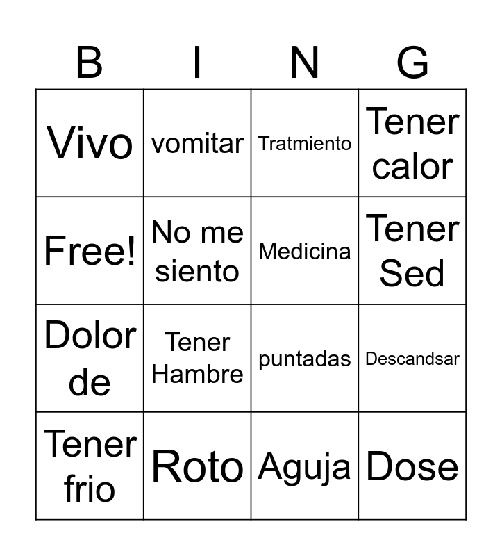 This bingo card has 16 words: Roto, Descandsar, Tratmiento, Vivo, Dolor de, vomitar, puntadas, Aguja, Free!, No me siento, Tener frio, Tener calor, Tener Hambre, Tener Sed, Medicina and Dose.