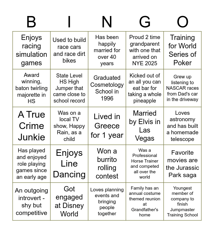 This bingo card has 59 words: Free!, Got engaged at Disney World, Convinced their own kids they were pirates prior to the kid's birth, Has played and enjoyed role playing games since an early age, Family has an annual costume themed reunion at Grandfather's home, 4 years of experience playing the saxophone, State Level HS High Jumper that came close to school record, Has been on a surfing trip to Australia, Kicked out of an all you can eat bar for taking a whole pineapple, Going to Alaska with a goal to paddleboard through a glacier, Proud 2 time grandparent with one that arrived on NYE 2025, Was an "extra" in the movie "Hearts of Atlantis", Award winning, baton twirling majorette in HS, Published Author, Taken Flying Lessons working towards a pilot's license, Enjoys racing simulation games, Lived in Greece for 1 year, Training for World Series of Poker, Has a vinyl record collection in excess of 400 albums, Graduated Cosmetology School in 1996, Married by Elvis in Las Vegas, Has been happily married for over 40 years, An outgoing introvert - shy but competitive, Favorite movies are the Jurassic Park saga, Was a competitive BMX bike racer, Likes to wear and collect hats, Was on a National Infomercial for Better Living Sunrooms, Has won two cruises for singing karaoke, Grew up listening to NASCAR races from Dad's car in the driveway, Introduced to a whole new family via Ancestry DNA, The CEO of a Non-Profit Organization, Used to put together music recording studios, Worked on the Flight Deck in the Navy, Active member of a National Steelers Football Club, Used to build race cars and race dirt bikes, Obsessed with donkeys, Wrote, recorded and produced my own hip hop music, Was on a local TV show, Happy Rain, as a child, Ranked 4th in an APA Pool League, A True Crime Junkie, Enjoys cooking and has a smokehouse at home, Enjoys Line Dancing, Loves astronomy and has built a homemade telescope, Worships their dogs as if they were human, Loves cheesy comedy movies, Was an "extra" in "The Handmaid's Tale", Biked 3 miles to school daily in Honduras, Has lost 100 pounds since 2012, Won a burrito rolling contest, Loves planning events and bringing people together, Love turtles and always stops to help if seen on the road, Enjoys spending time at Lake House on Lake Kerr, Big EPL fan whose favorite team is Manchester United, Enjoys playing board games, Worked for Donald Trump in college at Trump Place in NYC, Was a Professional Horse Trainer and competed all over the world, Rebuilt a Chevy 350 motor at 15 years old, Youngest member of company to finish Jumpmaster Training School and Was always left in charge of older brothers as a child.