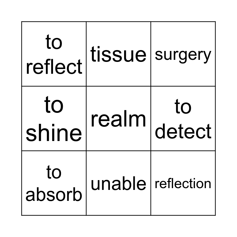 This bingo card has a free space and 8 words: to detect, surgery, tissue, to absorb, to reflect, reflection, to shine and unable.