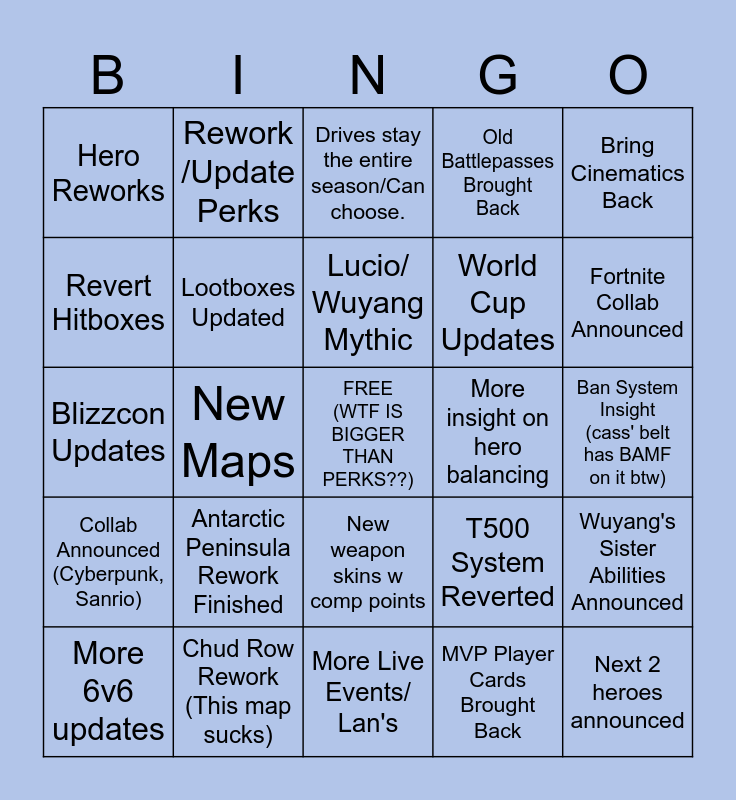 This bingo card has a free space and 24 words: Antarctic Peninsula Rework Finished, Chud Row Rework (This map sucks), Lucio/ Wuyang Mythic, More 6v6 updates, Bring Cinematics Back, Hero Reworks, Revert Hitboxes, Rework /Update Perks, More insight on hero balancing, New weapon skins w comp points, World Cup Updates, Blizzcon Updates, T500 System Reverted, Wuyang's Sister Abilities Announced, Lootboxes Updated, MVP Player Cards Brought Back, Ban System Insight (cass' belt has BAMF on it btw), Drives stay the entire season/Can choose., Fortnite Collab Announced, New Maps, Next 2 heroes announced, Collab Announced (Cyberpunk, Sanrio), Old Battlepasses Brought Back and More Live Events/ Lan's.