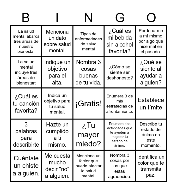 This bingo card has a free space and 24 words: Cuéntale un chiste a alguien., Hazte un cumplido a ti mismo., Nombra 3 cosas buenas de tu vida., Nombra 3 cosas por las que estás agradecido., Perdonarme a mí mismo por algo que hice mal en el pasado., La salud mental abarca tres áreas de nuestro bienestar, Menciona un dato sobre salud mental., Tipos de enfermedades de salud mental, Enumera 3 de mis estrategias de afrontamiento., Establece un límite, ¿Cuál es tu canción favorita?, Indique un objetivo para el alta., Enumera dos actividades que te ayuden a mejorar tu estado de ánimo., Describe tu estado de ánimo en este momento., La salud mental incluye tres áreas de bienestar:, Me cuesta mucho decir "no" a alguien., Menciona un factor que puede afectar la salud mental., ¿Cuál es mi bebida sin alcohol favorita?, ¿Qué se siente al ayudar a alguien?, 3 palabras para describirte, Indica un objetivo para tu salud mental., ¿Tu mayor miedo?, ¿Cómo se siente ser deshonesto? and Identifica un color que te transmita paz..