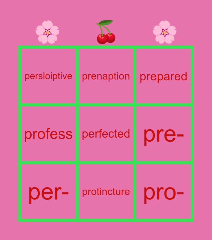 This bingo card has a free space and 8 words: pre-, prepared, prenaption, per-, persloiptive, pro-, profess and protincture.