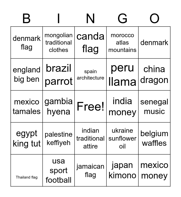 This bingo card has a free space and 29 words: Thailand flag, Canada money, gambia hyena, new zealand haka, denmark flag, canda flag, brazil parrot, palestine keffiyeh, india money, usa sport football, senegal music, mexico money, jamaican flag, japan kimono, china dragon, australia flag, indian traditional attire, egypt king tut, denmark, mexico tamales, ukraine sunflower oil, south africa money, peru llama, england big ben, morocco atlas mountains, mongolian traditional clothes, belgium waffles, spain architecture and samoan handicrafts.
