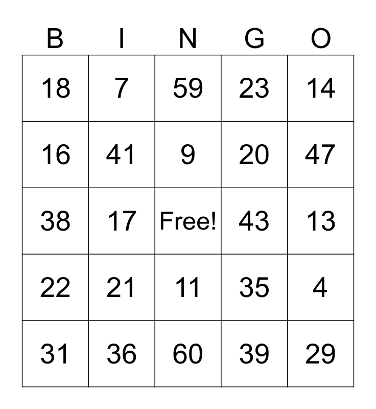 This bingo card has a free space and 66 words: 1, 2, 3, 4, 5, 6, 7, 8, 9, 10, 11, 12, 13, 14, 15, 16, 17, 18, 19, 20, 21, 22, 23, 24, 25, 26, 27, 28, 29, 30, 31, 32, 33, 34, 35, 36, 37, 38, 39, 40, 41, 42, 43, 44, 45, 46, 47, 48, 49, 50, 51, 52, 53, 54, 55, 56, 57, 58, 59, 60, 61, 62, 63, 64, 65 and 66.