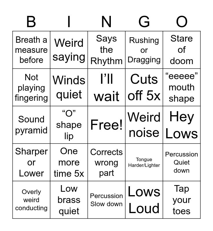 This bingo card has a free space and 24 words: One more time 5x, Low brass quiet, I’ll wait, Overly weird conducting, Stare of doom, Breath a measure before, Not playing fingering, Weird saying, Weird noise, Corrects wrong part, Cuts off 5x, Sound pyramid, Tongue Harder/Lighter, Percussion Quiet down, Winds quiet, Lows Loud, Hey Lows, Says the Rhythm, “eeeee” mouth shape, “O” shape lip, Tap your toes, Sharper or Lower, Rushing or Dragging and Percussion Slow down.