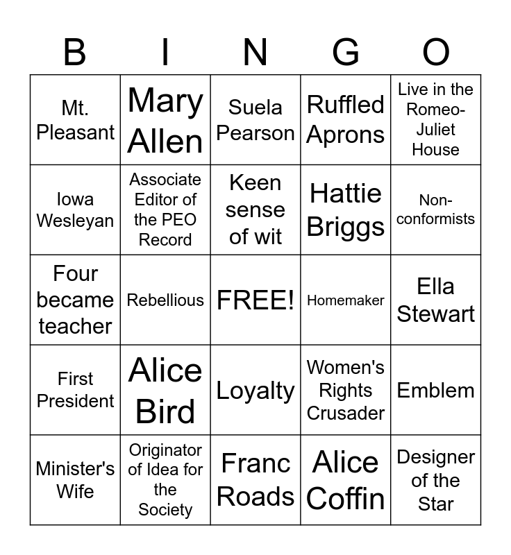 This bingo card has a free space and 24 words: Alice Bird, Originator of Idea for the Society, Keen sense of wit, Minister's Wife, Live in the Romeo-Juliet House, Mt. Pleasant, Iowa Wesleyan, Mary Allen, Homemaker, Loyalty, Hattie Briggs, Four became teacher, Women's Rights Crusader, Emblem, Associate Editor of the PEO Record, Alice Coffin, Ella Stewart, Suela Pearson, Non-conformists, Rebellious, Designer of the Star, First President, Ruffled Aprons and Franc Roads.