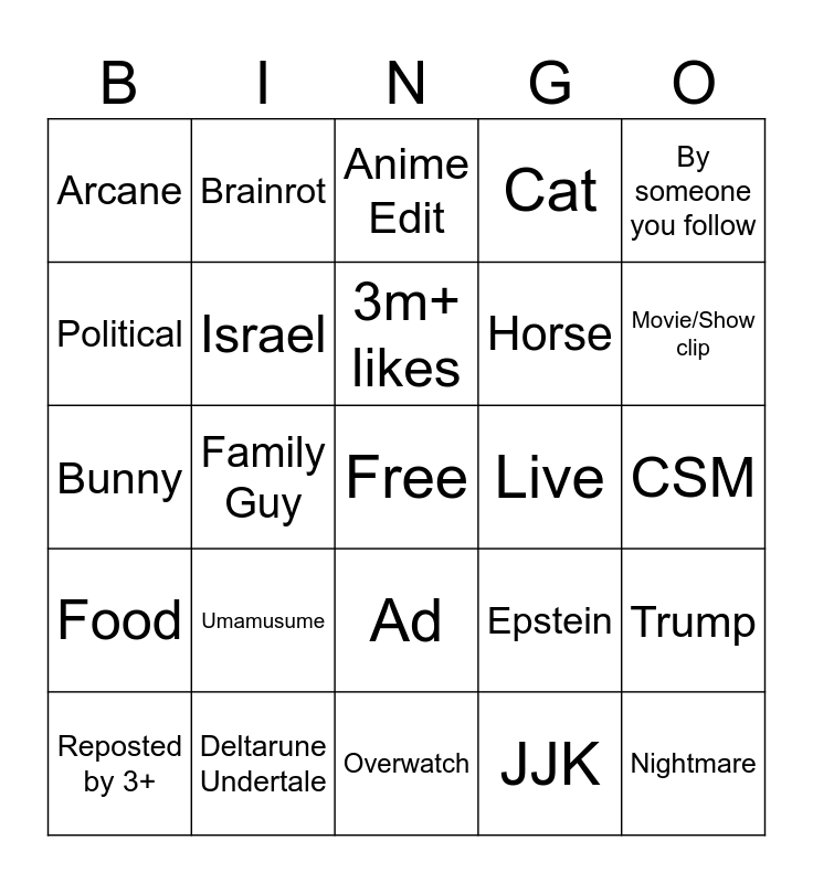 This bingo card has a free space and 24 words: Umamusume, Deltarune Undertale, 3m+ likes, Reposted by 3+, By someone you follow, Arcane, Political, Brainrot, Live, Ad, Horse, Bunny, Epstein, Trump, Israel, JJK, CSM, Anime Edit, Movie/Show clip, Family Guy, Nightmare, Food, Cat and Overwatch.