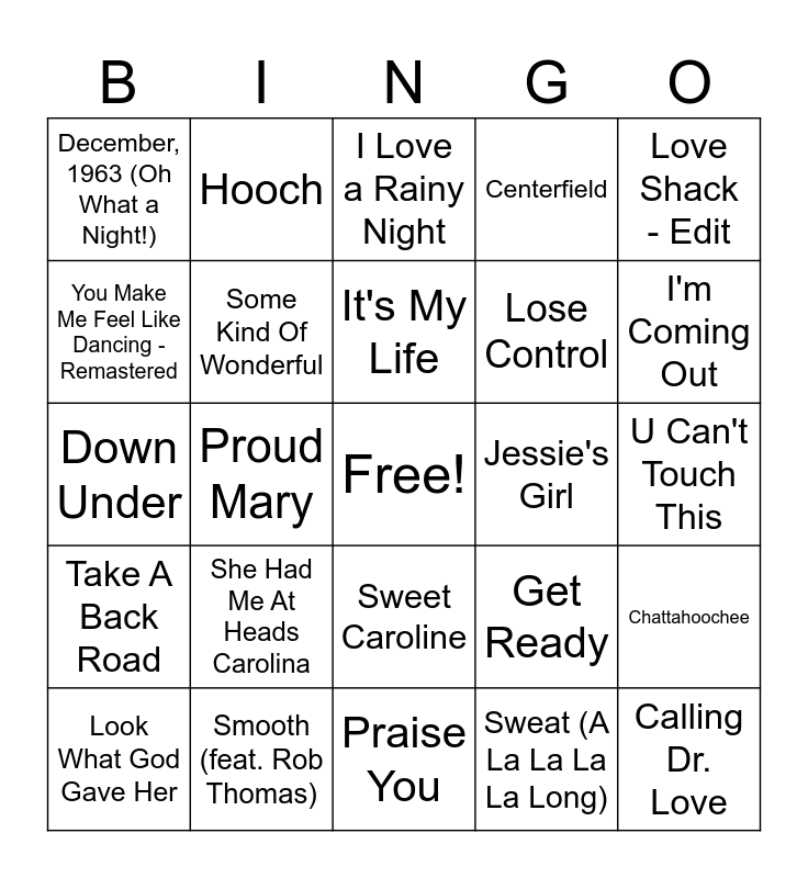 This bingo card has a free space and 90 words: Barbie Girl, Walking On Sunshine, Sweet Caroline, Uptown Girl, Mambo No. 5 (a Little Bit of...), Conga!, Gloria, Sugar Sugar, Man! I Feel Like A Woman!, Respect, Livin' la Vida Loca, Jailhouse Rock, Celebration, U Can't Touch This, La Bamba, It's My Life, Purple Rain, Fast Car, Pump Up The Jam, Sultans Of Swing, Jump Around, Party In The U.S.A., Praise You, Like a Virgin, Down Under, Smooth (feat. Rob Thomas), Cruise, Why Don't We Just Dance, Smoke A Little Smoke, I Love This Bar, The Git Up, Chattahoochee, Wine, Beer, Whiskey, Take A Back Road, December, 1963 (Oh What a Night!), Centerfield, I Love a Rainy Night, All Summer Long, Proud Mary, I'm Coming Out, Look What God Gave Her, You Make Me Feel Like Dancing - Remastered, Cupid Shuffle, Atomic Dog, Get the Party Started, Get Ready, Boots on the Ground, Shut Up and Dance, Shoop, Get Down On It, Hey Ya!, Lose Control, Fat Bottomed Girls - Single Version / Remastered 2011, Lil Boo Thang, To Be With You, Footloose, Jessie's Girl, 24K Magic, Good Feeling, Margaritaville, Last Night, Heartache On The Dance Floor, Gettin' Jiggy Wit It, Chunky, Tush, Disco Inferno, Father Of Mine, Sweat (A La La La La Long), Brick House, All About Tonight, She Had Me At Heads Carolina, Calling Dr. Love, Swingtown, Just Like Johnny, Hooch, Some Kind Of Wonderful, Play That Funky Music, I Shot The Sheriff, Rumor, Mr. Jones, I Go Blind, Love Shack - Edit, Bad Dreams, Go All The Way, I Won't Back Down, Night Moves, Brandy (You're a Fine Girl), Someday, Run-Around and Return of the Mack.