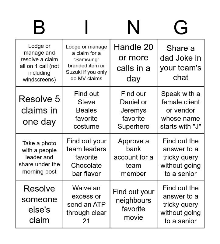 This bingo card has 16 words: Waive an excess or send an ATP through clear 21, Find out the answer to a tricky query without going to a senior, Handle 20 or more calls in a day, Lodge or manage and resolve a claim all on 1 call (not including windscreens), Take a photo with a people leader and share under the morning post, Lodge or manage a claim for a "Samsung" branded item or Suzuki if you only do MV claims, Approve a bank account for a team member, Find out your neighbours favorite movie, Resolve 5 claims in one day, Find out Steve Beales favorite costume, Resolve someone else's claim, Share a dad Joke in your team's chat, Find out your team leaders favorite Chocolate bar flavor, Speak with a female client or vendor whose name starts with "J", Find our Daniel or Jeremys favorite Superhero and Find out the answer to a tricky query without going to a senior.